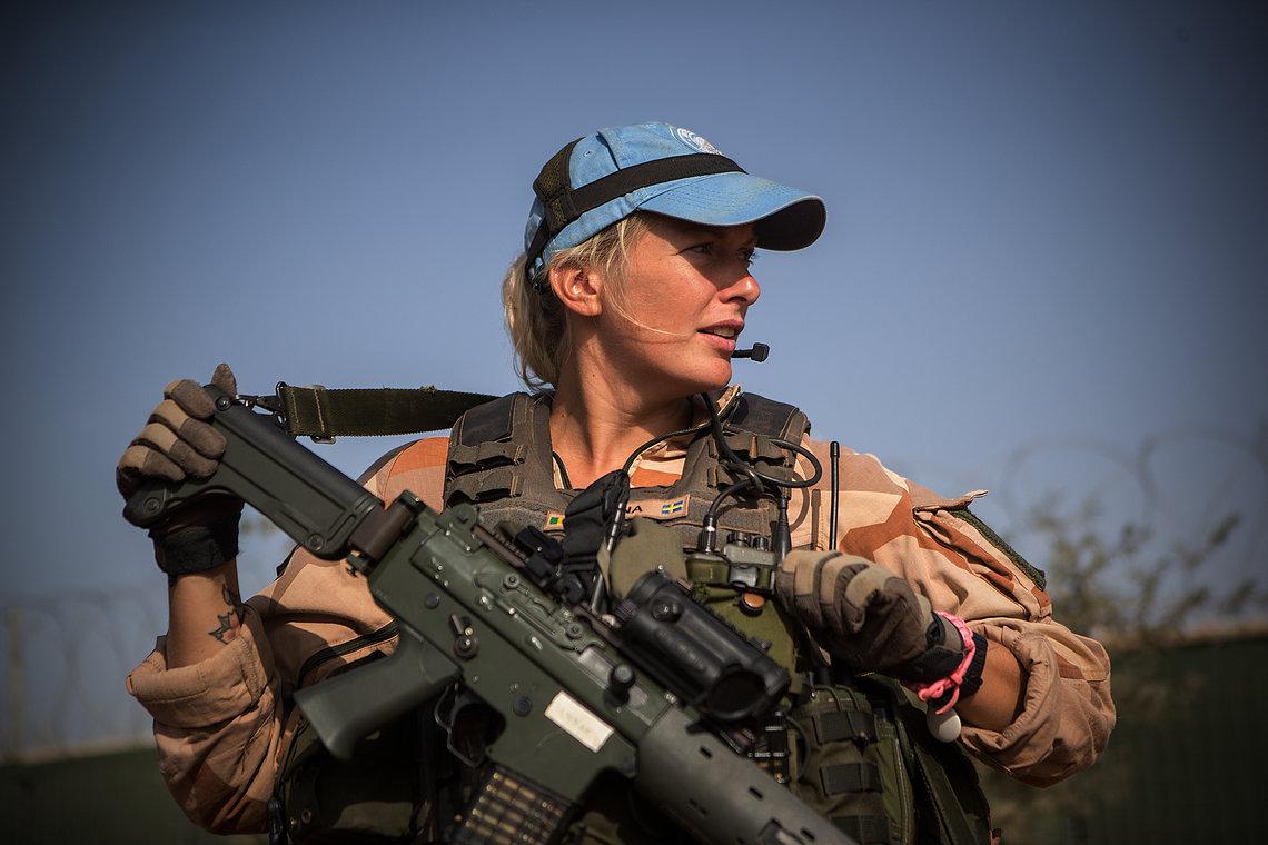 | في عام 2018، تم نشر 25 امرأة في مالي في كتيبة من 252 من أفراد الجيش السويدي. يقوم أحد جنود حفظ السلام السويديين بدورية في تمبكتو في شمال الدولة الواقعة في غرب إفريقيا. |