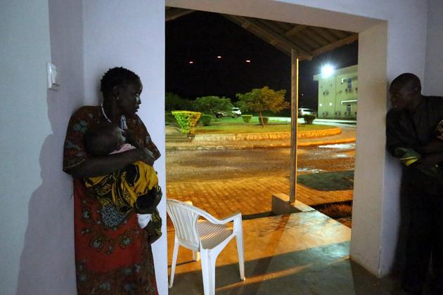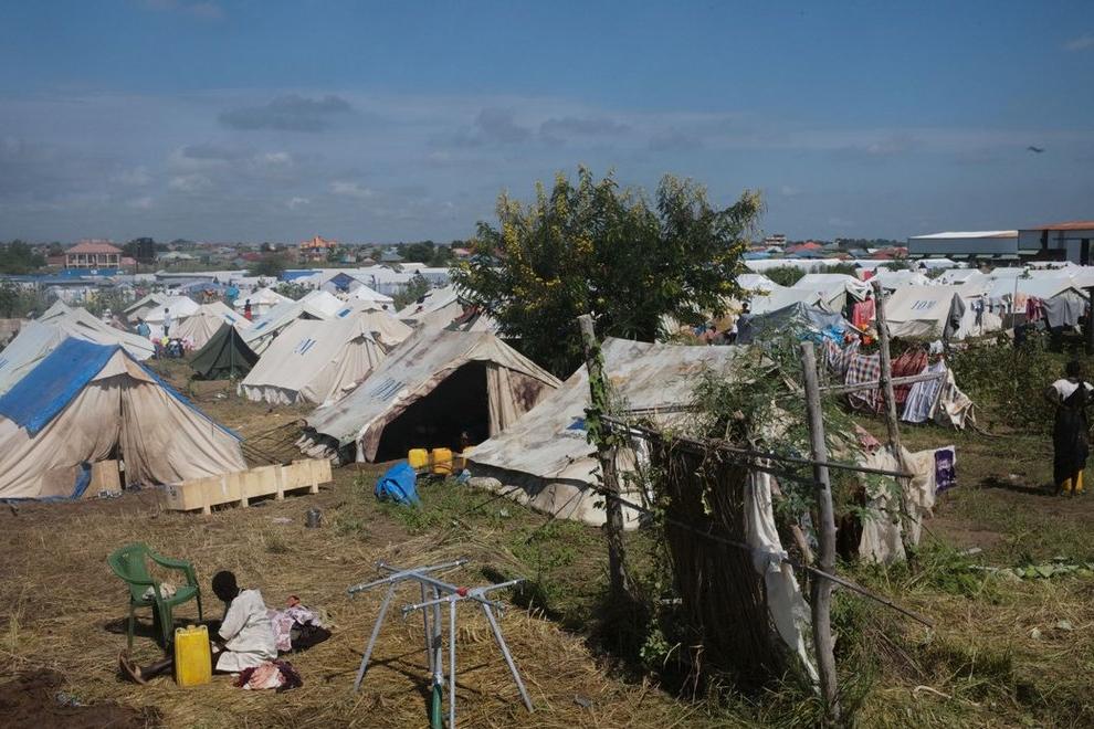 Mangateen, relatively near central Juba. A makeshift camp for some 3,500 recently and voluntarily relocated displaced persons. We are standing outside a huge warehouse made to look small by the hundreds and hundreds of people…