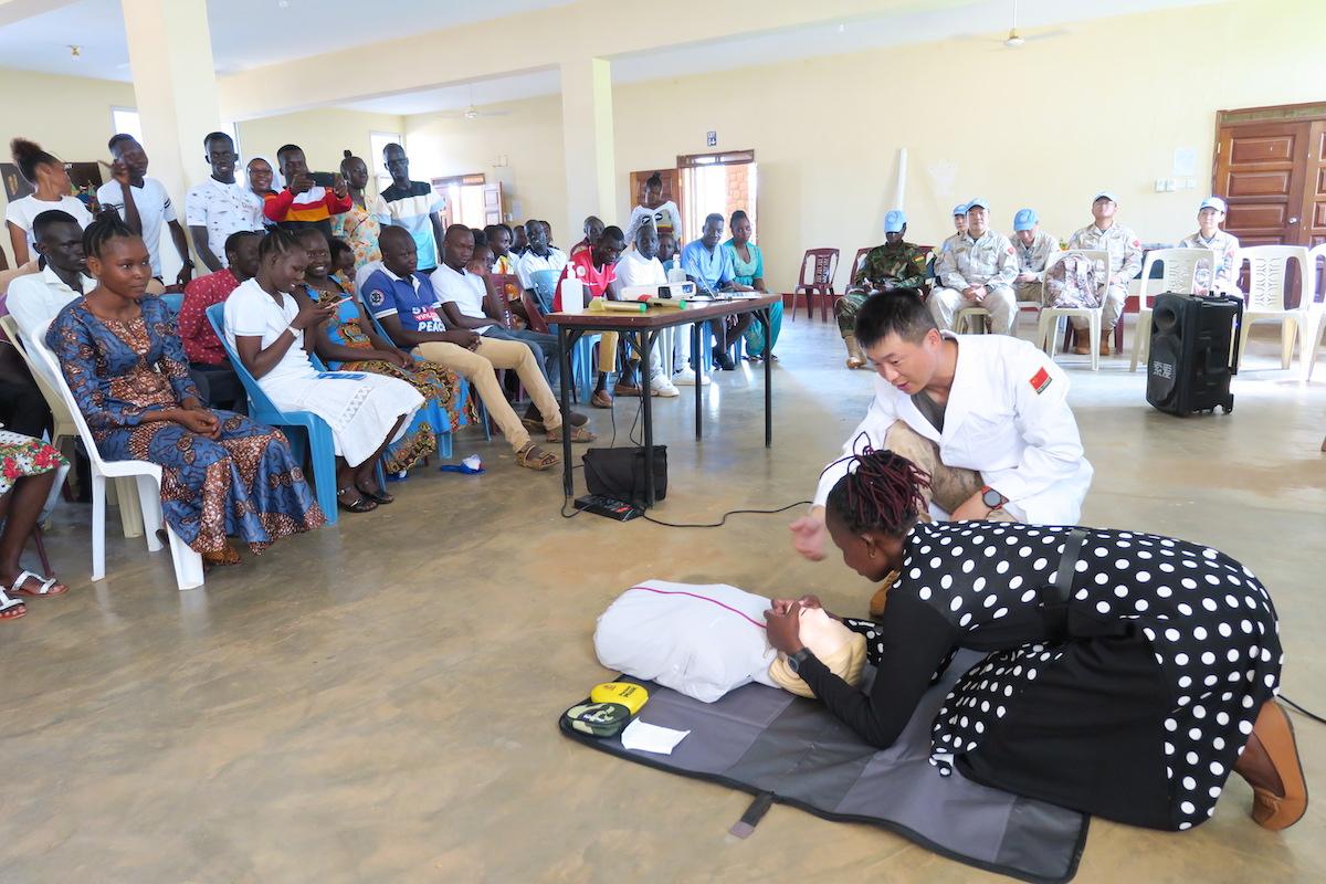 Practice makes perfect as students at the Catholic Health Training Institute learn new skills from UNMISS medical peacekeepers from China. Photo: Michael Wondi/UNMISS WESTERN BAHR EL GHAZAL- Students at the Catholic Health…
