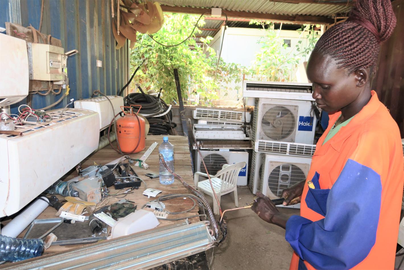Margaret Othow, an electrician working with UNMISS in Malakal, speaks about being the only woman in her team and choosing to train in what is considered an unusual profession for women in South Sudan. Photo by Samson Liberty…