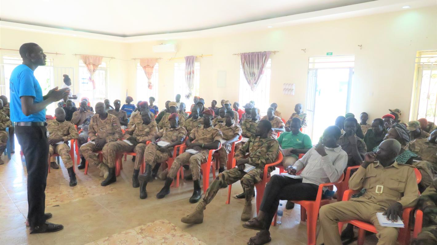 Civilians and military personnel from Central Equatoria state participate in a peacebuilding dialogue in Lobonok. Photo by James Sokiri/UNMISS.