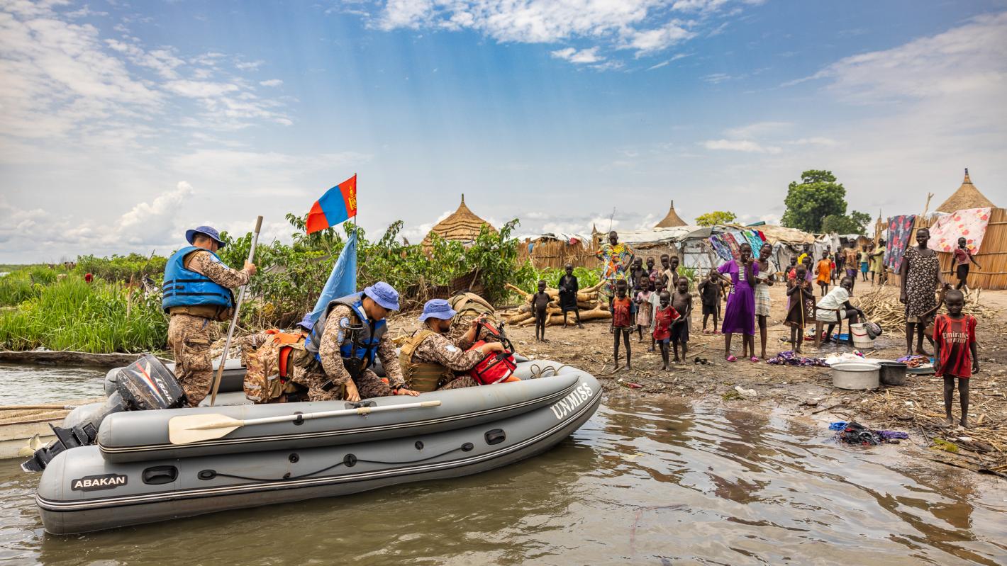 UNITY - Transformed into a watery archipelago by nearly four years of relentless flooding, Unity State stands as a stark testament to the climate crisis.When the rains first began, thousands scrambled to find dry land. Today, for communities who managed to stay above water, there are new battles that must be fought. Recently, Mongolian peacekeepers from the United Nations Mission in South Sudan (UNMISS), travelled by boat to Thong, a former town that has now—thanks to incessant rainfall—become a riverine island.Journeying seven kilometres, crisscrossing through a labyrinth of purple and white waterlilies that conceal the grim reality of submerged villages, Blue Helmets made their way carefully to this isolated settlement of roughly 5,000 people. Life has changed dramatically for Thong residents. Farming, once their primary means of survival, is now all but impossible.Gatluek Shackdet, a community member, portrayed the situation vividly: "Thong, once rich with arable land and vibrant community life, is now caught in an idle struggle for survival post-flooding. Travel to Rubkona, previously possible by car or foot, is now only feasible by boat. River work and subsistence on water lilies and fish barely feed our families.”Given numerous roads have become completely inaccessible, it is difficult for humanitarian services, concentrated in high population density areas like Bentiu and Rubkona, to visit small community clusters such as Thong frequently."Reaching markets or aid stations now requires a costly boat ride for communities like those in Thong. We see women crafting small boats, pushing supplies through water, and enduring a challenging seven-kilometre trip,” said Jane Kony, acting head of the UNMISS Field Office in Bentiu. Since floods began in 2021, hundreds of thousands have been displaced. Sergeant Batbileg, a Mongolian peacekeeper who led the mission to Thong, explained how UNMISS has had to adapt. "The floods are catastrophic, but we understood that we may have to live with them for years to come. Therefore, we changed our approach and devised new ways to reach communities in need,” he stated. “Many have been relocated to internally displaced people’s sites, but we can’t forget about those in the floodwaters. Our visit to Thong was to build confidence in the community and ensure they can access the aid and support they need. We want them to know they are not forgotten,” he added. Despite all the hardships they have undergone, residents of Thong remain hopeful. “I'm glad to see peacekeepers. They don’t merely protect us from conflict but with all they have done for flood-ravaged community members, they have become part of our social fabric; I pray they will remember Thong and continue their support," explained Mr. Shackdet. Thong, and other isolated settlements on the brink of submersion face an uncertain future but UNMISS remains committed to ensuring every South Sudanese, no matter where they are, can access life-saving support.“We do not go to these places because it is easy, we go because it is our mandate to protect civilians wherever they are, regardless of how difficult to reach they may be,” explained Ms. Kony.