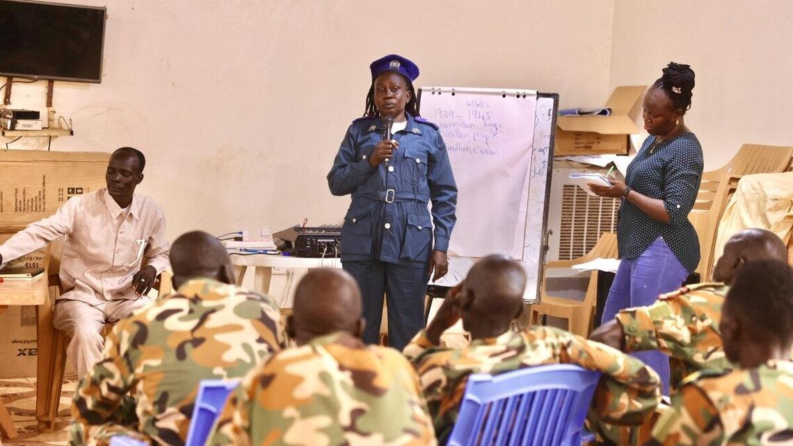 With calm restored, Mundrua Jeromei, a Child Protection Officer serving with the United Nations Mission in South Sudan (UNMISS), seized the moment to remind military personnel and civilians alike about often overlooked occurrences that put girls and boys at risk.