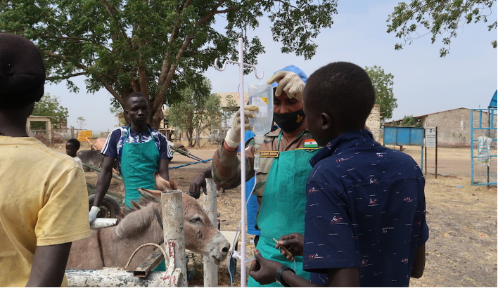 A weekly veterinary clinic is a longstanding tradition in Malakal, South Sudan, thanks to Indian peacekeepers serving with the UN Mission in South Sudan (UNMISS). From 2006–2015, and picking up again in 2018 after a hiatus during heightened conflict in the region, Indian peacekeepers offered free veterinary services and training for local farmers to ensure the health of their livestock. With no other veterinarians treating animals in Malakal, UNMISS’ veterinary services saved lives and livelihoods.