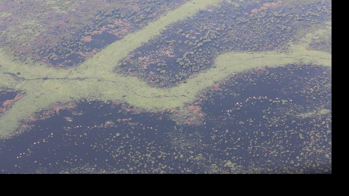 Touching down, the reality of what lies beneath this colourful quilt is shocking. A shroud of green and purple lilies covers a deep sea of filthy water full of rubbish, rotting animal carcasses, and snakes carving their way through the debris.