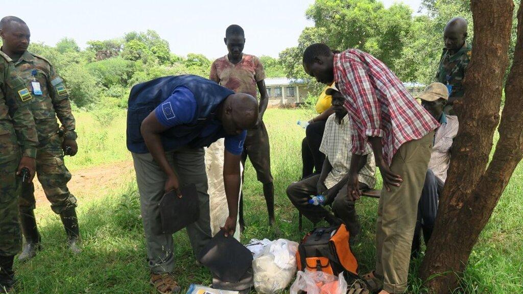 UNMISS peacekeepers with residents of Lafon County, who managed to recover goods stolen from a humanitarian partners as one of its convoys was recently ambushed. Photos: Moses Yakudu/UNMISS