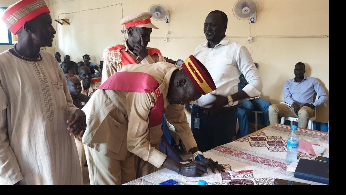Participants from three counties in Lakes State sign a document with agreed-on resolutions to reduce intercommunal tensions. Photo: James Mawien Manyuol/UNMISS