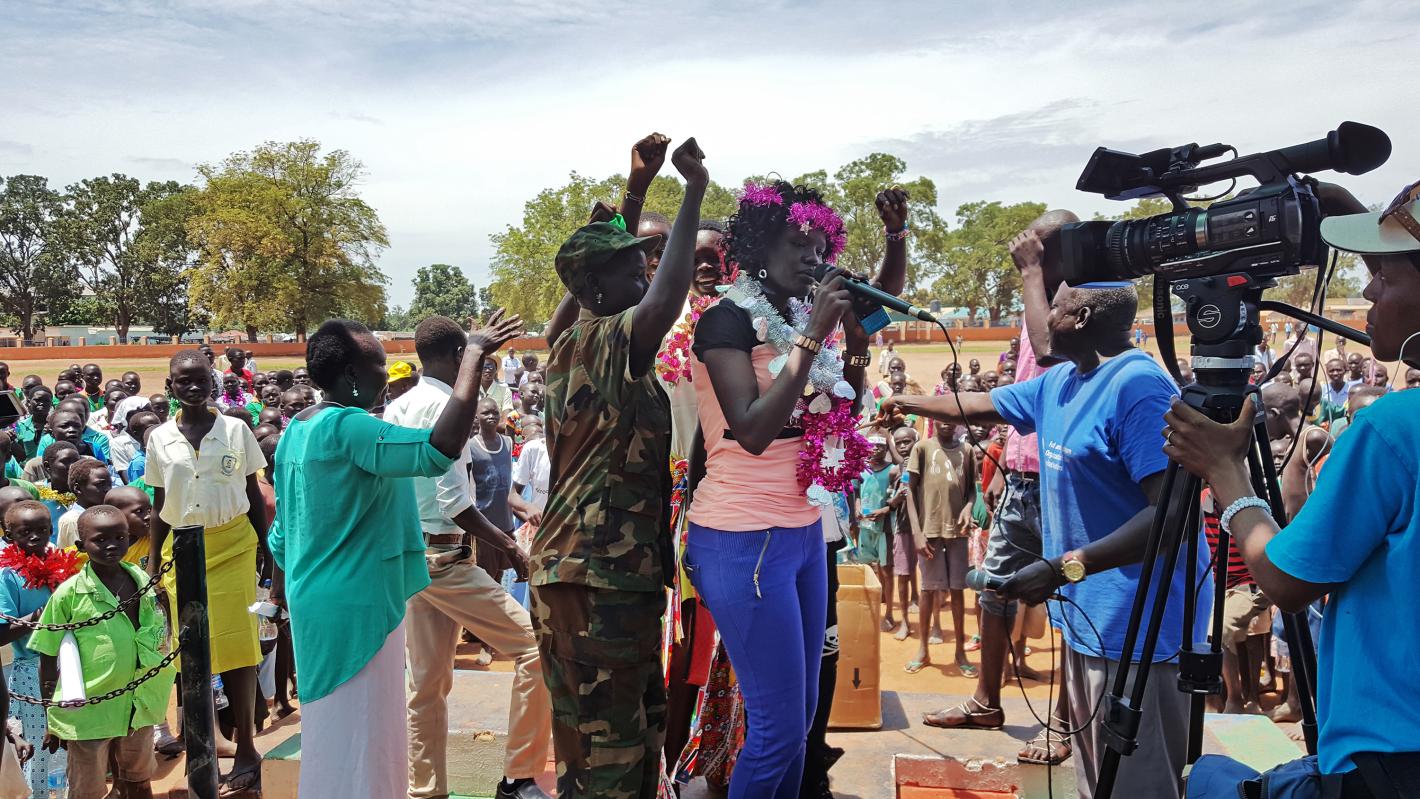 Akuruel Makuei Maiwer, local artist, gives an impassioned peformance before the crowd at the 'Women for Peace Concert' on Monday, 4 September 2017 in Rumbek, South Sudan. The event, organized by the United Nations Mission in South Sudan, aimed to empower women through music and drama. UNMISS /Muna Tesfai