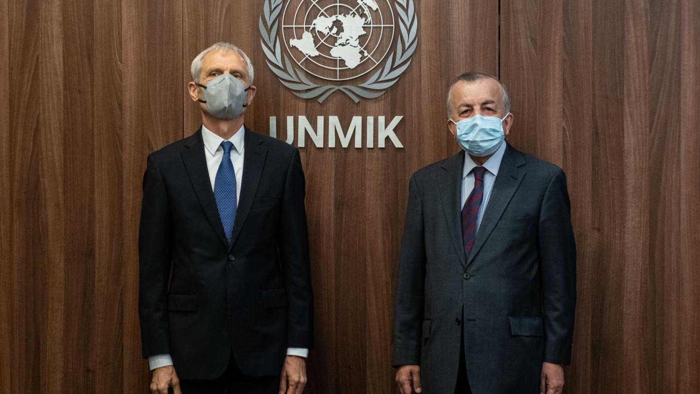 The Special Representative of the Secretary-General and Head of UNMIK, Mr. Zahir Tanin, welcomed the Ambassador of Switzerland, Mr. Thomas Kolly, at UNMIK Headquarters on 19 April 2021. The SRSG was joined by the Deputy SRSG, Ms. Barrie Lynne Freeman.