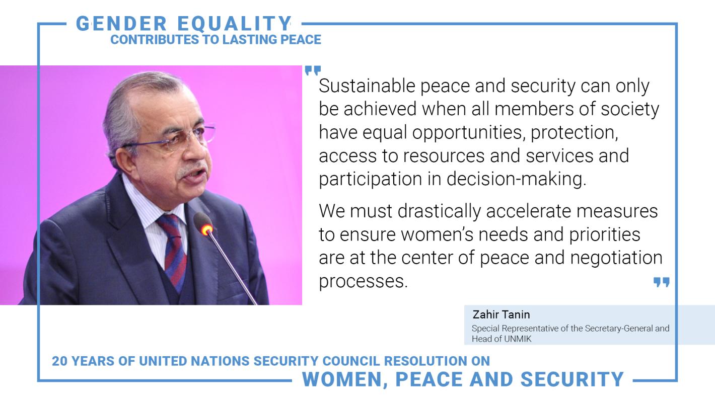 On the occasion of the 20th anniversary of United Nations Security Council resolution 1325 (2000) on Women, Peace and Security, the Special Representative of the Secretary-General (SRSG) and Head of UNMIK, Zahir Tanin, reaffirms UNMIK’s commitment to continue supporting the advancement of women’s full and meaningful participation in peace and negotiation processes.
