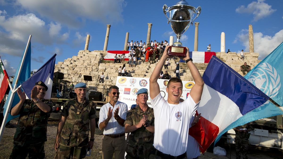UNIFIL’s Force Commander Reserve (FCR) team captain raises the Military Olympiad Cup - 2017.
