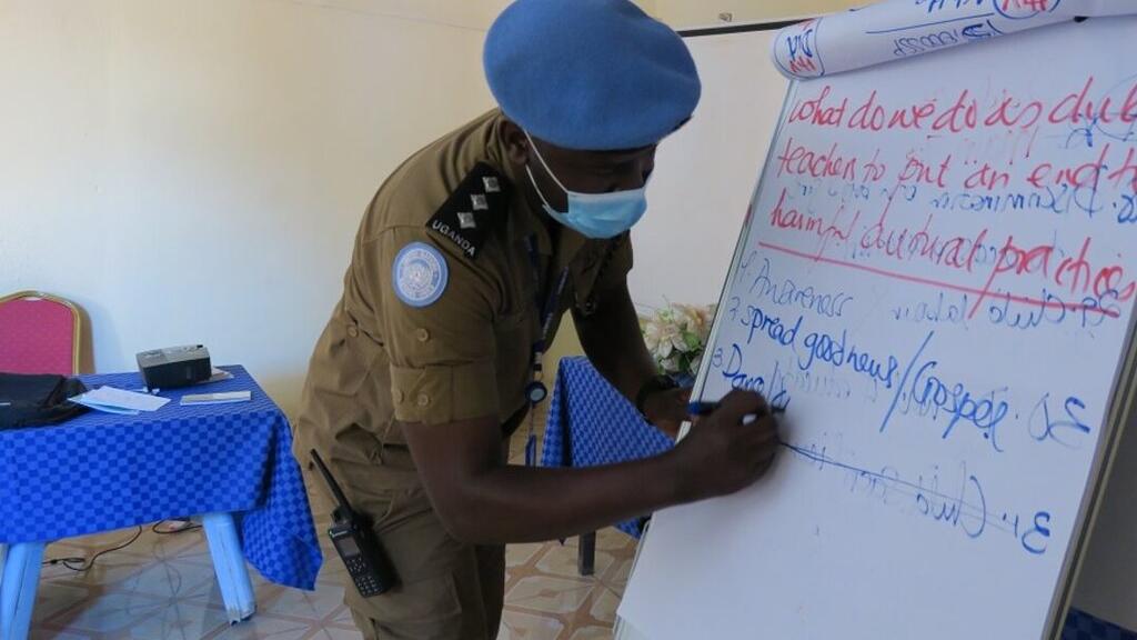 UNMISS police officers in Aweil raising awareness on how to report sexual abuse and incidents of forced and/or early marriages.
