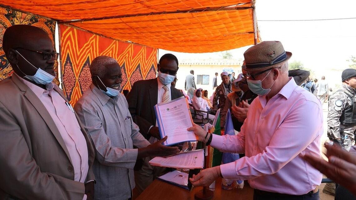 21 January; UNAMID officially handed over its Team Site in Saraf Omra, North Darfur to the Government of Sudan, in the presence of the local officials, representatives of the local community and UNAMID staff. The handover of Saraf Omra Team Site is part of the Mission’s drawdown process that is in line with the UN Security Council Resolution 2559 (2020), which terminated UNAMID mandate as of 31 December 2020 and authorized a six-month period for the Mission to complete the withdrawal of all uniformed and civilian UNAMID personnel by 30 June 2021, other than those required for the mission’s liquidation. The handover documents were signed by Mr. Houston Fergusson, Director of the Mission Support Division, on behalf of UNAMID and Mr. Hafiz Bakhit, signed on behalf of the North Darfur State Government.
