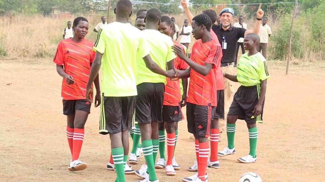 Before leaving the school, the visiting peacekeepers handed over a collection of items useful for athletes and students alike: footballs, a pump to inflate them, jerseys, socks, boots, and exercise books.