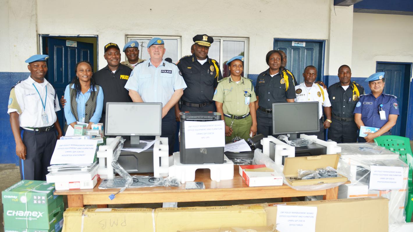 Monrovia – On 29 June, the United Nations Mission in Liberia (UNMIL) handed over furniture and office equipment to the National Police Policy Management Board (PMB) at the Liberia National Police (LNP) headquarters in Monrovia. The donation, office desks, chairs, filling cabinets, computers, a printer, photocopiers, assorted electronics and stationery were provided as part of the Quick Impact Project (QIP) scheme of UNMIL. The furniture and equipment will facilitate the operationalization of the Policy Management Board in line with the LNP Act of 2016.