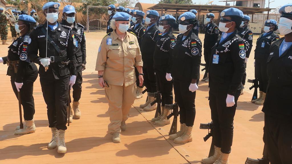 On a field visit to Bentiu, UNMISS Police Commissioner Christine Fossen was treated to a guard of honour by Ghanaian colleagues. Photo: Jacob Ruai/UNMISS