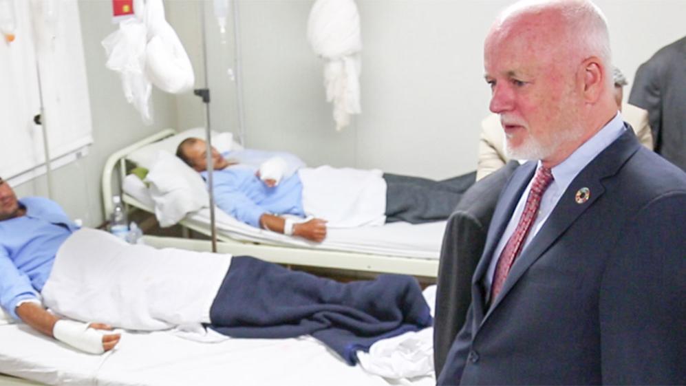 Arriving in Bangui on Wednesday, May 10, 2017 to reaffirm the commitment of the organization to the authorities and people of the Central African Republic and to support the government in achieving sustainable development goals (SDG), the President of the United Nations General Assembly, Peter Thomson, accompanied by the President of the National Assembly, Karim Meckassoua, the Prime Minister, Simplice Sarandji and the Special Representative of the Secretary-General and Head of MINUSCA, Parfait Onanga-Anyanga, went to MINUSCA’s military hospital to visit the bedside of the UN peacekeepers that were wounded during the attack on their convoy on Monday 8 May near the village of Yogofongo, 20 km from Bangassou in the south-east of the Central African Republic. Peter Thomson comforted the wounded personally and on behalf of the organization and took the opportunity to salute the dedication of peacekeepers engaged in all theaters of operations in the name of peace. Four peacekeepers, all Cambodian, were killed in the attack.