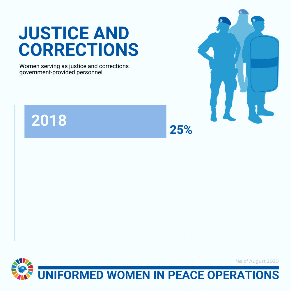 Advancement towards gender parity goals, through the increased representation of women among government-provided justice and corrections personnel (GPP) from 25% in 2018 to 29% in December 2019, thereby exceeding the 2019 target as per the Uniformed Personnel Gender Parity Strategy; Nominations of women GPP make up approximately 25% of 2019 nominations, compared to 15% in previous years.