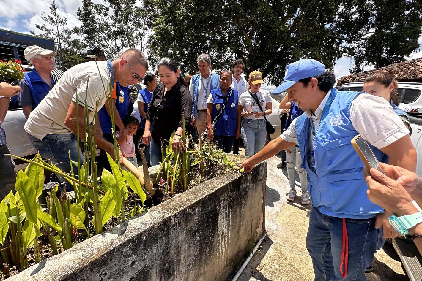Mohamed Sheikh Said Haji speaks with a microphone in front of a school