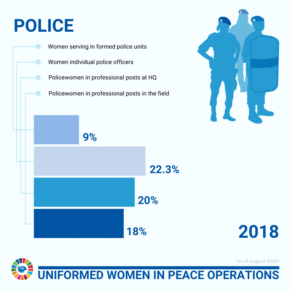 In line with United Nations Security Council Resolution 1325 (2000), which recognizes the importance of women’s participation in United Nations field-based operations, and resolution 2242 (2015), which calls for the doubling of the number of uniformed women personnel by 2020, the United Nations Police Division has undertaken several measures that have resulted in significant increases in the deployment of women police officers to field missions.