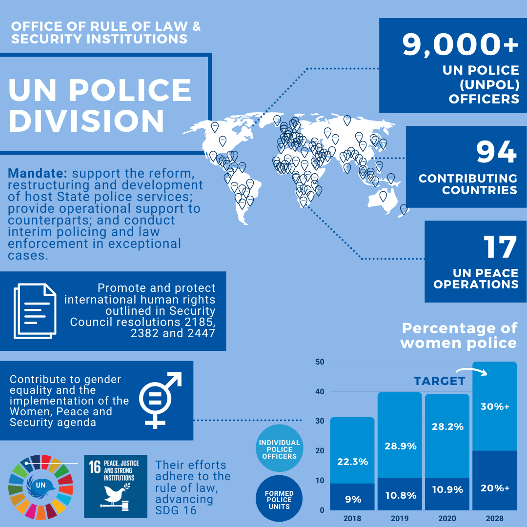 As a United Nations systemwide service provider and the focal point on policing and law enforcement matters, the United Nations Police (UNPOL) contribute across the entire peace and security continuum, advancing the political, development and humanitarian objectives of the United Nations, including Action for Peacekeeping and the 2030 Agenda for Sustainable Development.