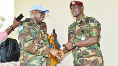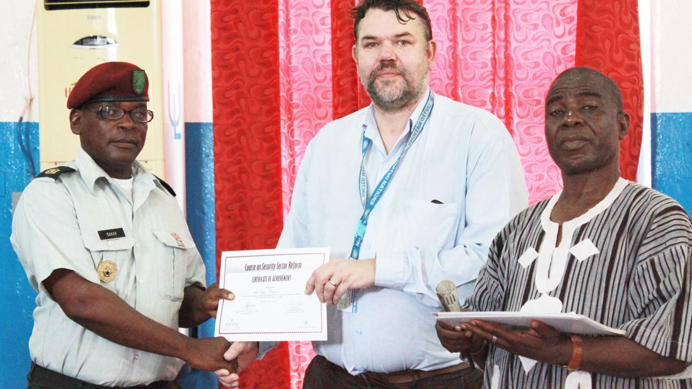 Michael Page, Head of Security Sector Reform Unit at UNMIL (middle) hands over a certificate to a trainee at the end of a five-day training session on Security Sector Reform in Monrovia, Liberia. Monrovia – On 9 June 2017…