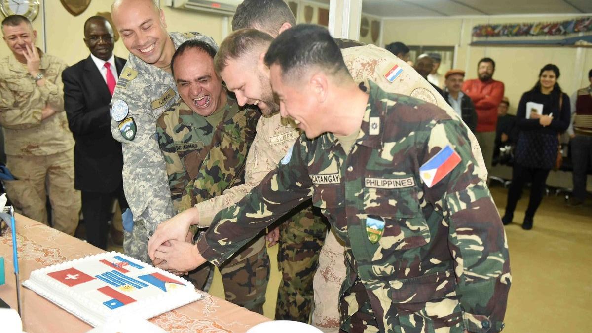 From left to right, the five outgoing UNMOs cut a cake during their farewell ceremony at UNMOGIP: Lt. Colonel Javier Cesar De Armas Serron (Uruguay), Major Henry Macatangay (Philippines), Major Victor Rodrigo Lobos (Chile)…