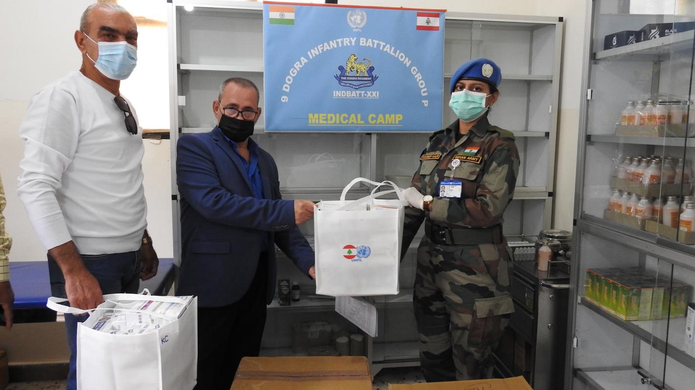 Major Ravdeep Kaur of UNIFIL (right) hands over 23 varieties of medicines to the head of Social Development Centre for the villages of Al Arkoub Union of Municipalities, Mohammad Saadi, on 29 May 2020. Photo: Corporal Gautam…