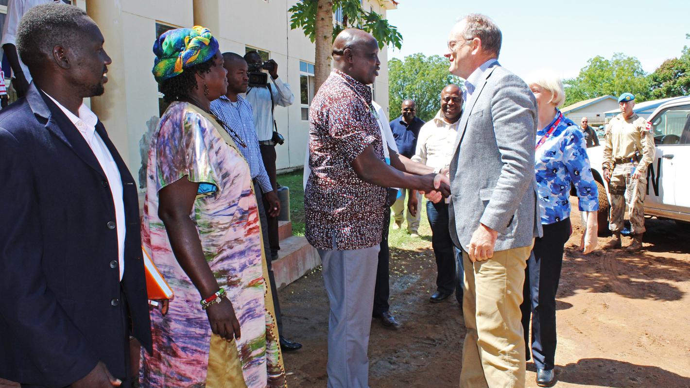 Imatong State Governor, Tobiolo Alberio Oromo greets United Nations Mission in South Sudan Special Representative to the Secretary-General, David Shearer in Torit on Wednesday Aug. 23, 2017. The United Nations Mission in…
