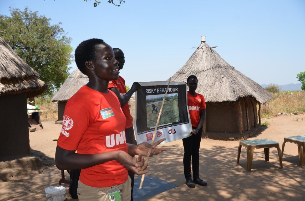 (Mary Arok delivering a training session on explosive ordnance risk education in Birisi village, in the southern part of South Sudan. Copyright: UNMISS)