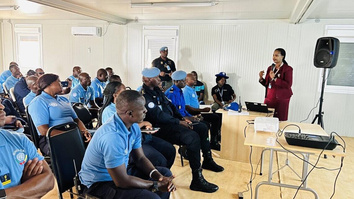 Nouvellement déployés à Bouar, 36 éléments, dont 6 femmes, de la 9e Unité de police constitué camerounaise ont été sensibilisés, le 20 octobre 2022, par l’Unité d’appui aux affaires pénitentiaires de la MINUSCA sur le respect des conditions de détention et des droits des personnes détenues par la MINUSCA, dans le cadre des mesures temporaires d’urgence (MTU).
