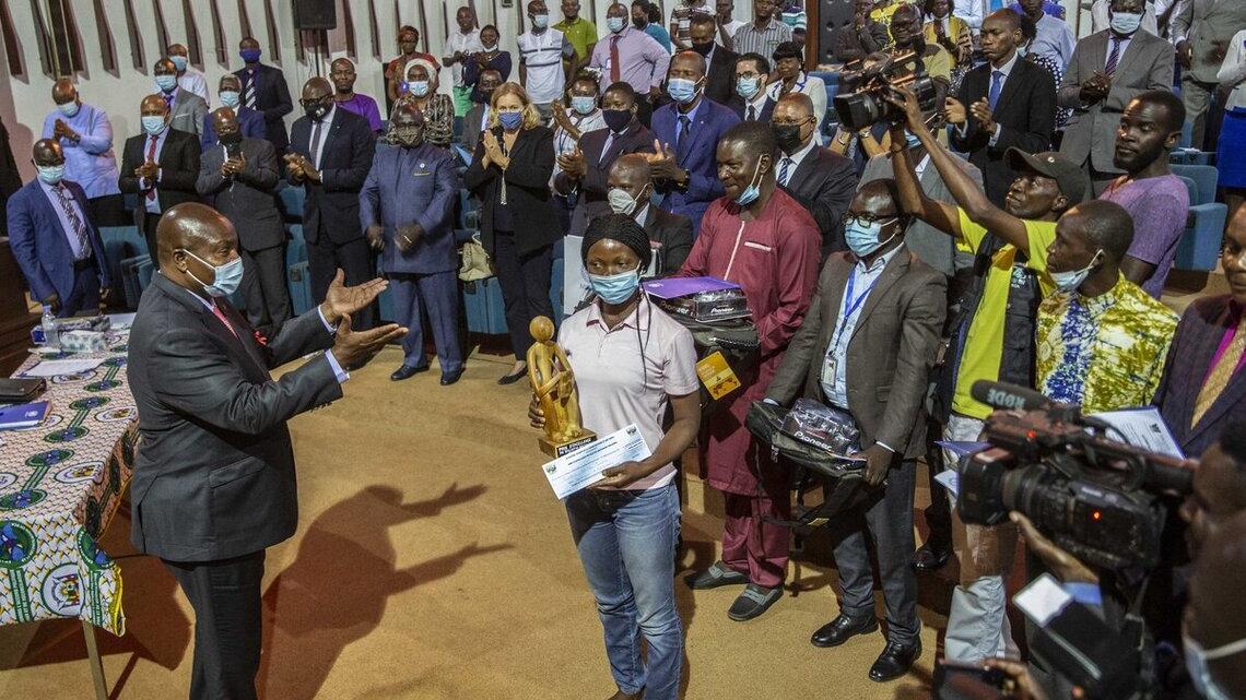 La cérémonie de remise des prix a été rehaussée par la présence du président Faustin Archange Touadera et du Représentant spécial du secrétaire général des Nations Unies et chef de la MINUSCA, Mankeur Ndiaye, ainsi que celle des hautes autorités centrafricaines.