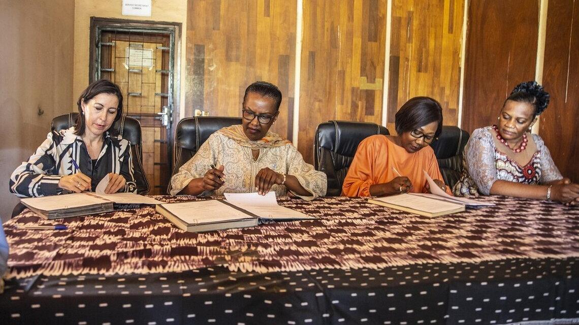 Valentine Rugwabiza, Représentante spéciale du Secrétaire général pour la République centrafricaine et Cheffe de la MINUSCA, ainsi que Meritxell Relano, Représentante de l'UNICEF en République centrafricaine, étaient présentes pour les Nations Unies. Le Gouvernement centrafricain, quant à lui, était représenté par la Ministre des affaires étrangères, de la Francophonie et des Centrafricains de l'étranger, Sylvie Baïpo Témon, et la Ministre de la promotion du genre, de la protection de la femme, de la famille et de l’enfant, Marthe Kirimat.