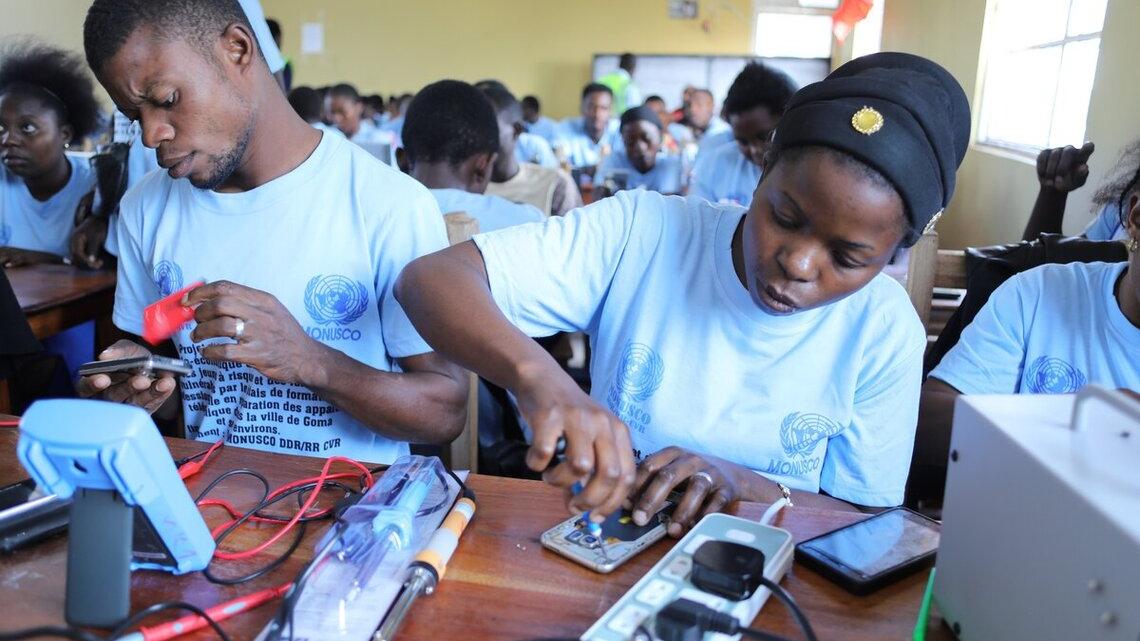 Après plus de deux mois d’apprentissage théorique en réparation de téléphones, 80 personnes à risque ont entamé la phase pratique de leur formation soutenue par la MONUSCO.