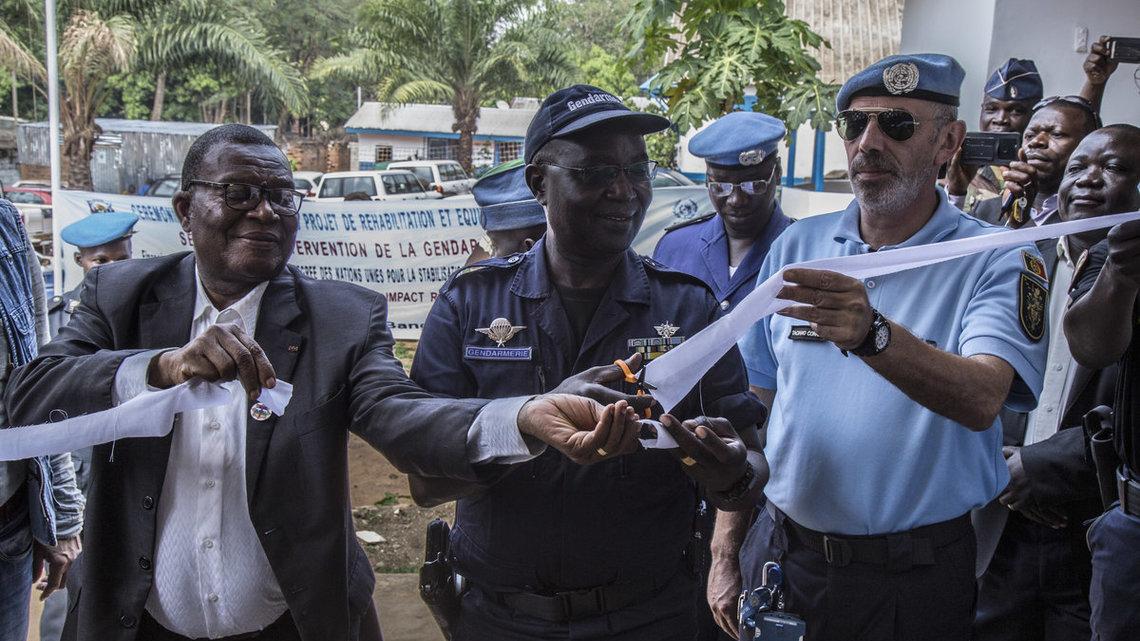 « La réhabilitation et l’équipement des locaux du GSIGN ont pour but d’améliorer considérablement les conditions de travail des personnels, et de faciliter la réaction dans les interventions, par la mise en place d’une section d’intervention permanente dotée d’outils fonctionnels », comme le souligne le Coordonnateur du Pilier Développement de la UNPol, le Colonel Taciano Alfredo Teixeira Correia, venu représenter le Chef de la composante police de la MINUSCA, lors de la remise des locaux, le lundi 19 novembre à Bangui, aux autorités compétentes, au nombre lesquels le Maire du 1er Arrondissement de Bangui, Jules ABEZOUA, le Directeur général adjoint de la Gendarmerie nationale, le Lieutenant-Colonel Célestin DOKOULA, et le Commandant du GSIGN, le Lieutenant-Colonel Didace NAMKIANGAA.