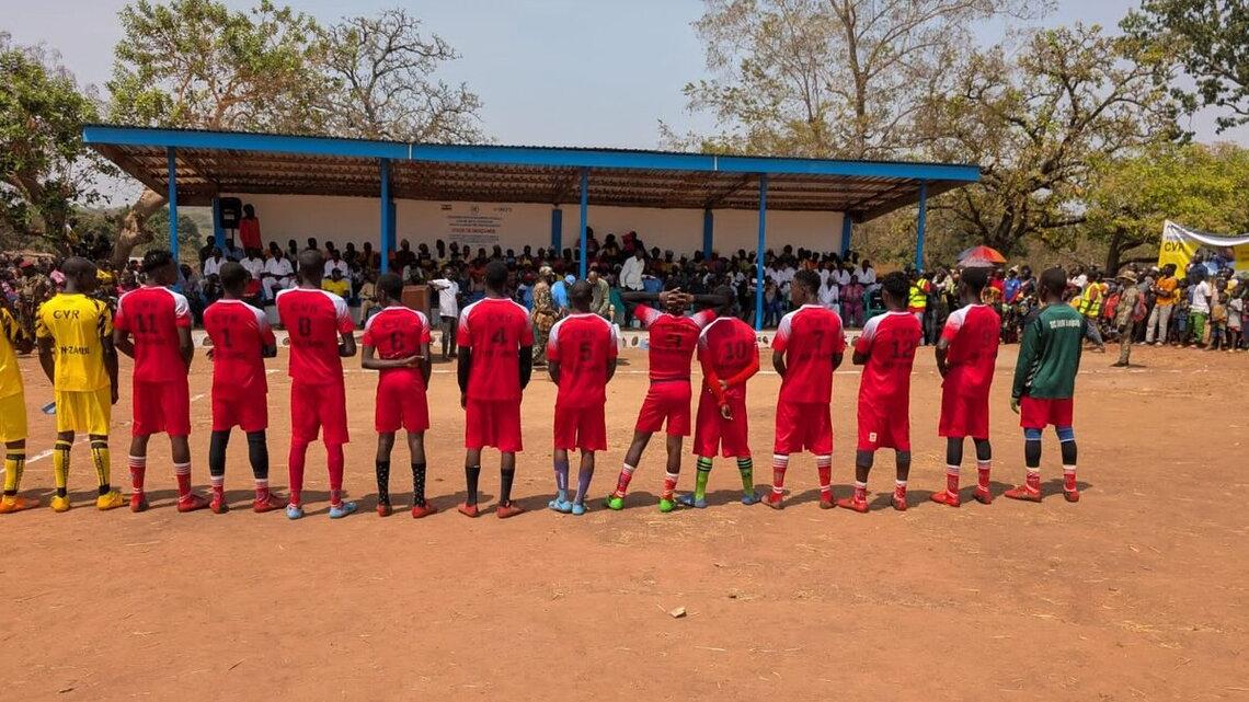 Benzambé dispose désormais d’un stade et de tous les équipements nécessaires pour jouer au football : Un terrain de football aux dimensions réglementaires, une tribune moderne construite par la main-d’œuvre locale formée dans le cadre du programme de réduction de la violence communautaire (CVR), des chaises plastiques, des jeux de maillots et des ballons, le tout pour un coût global de plus de 8 millions de FCFA.