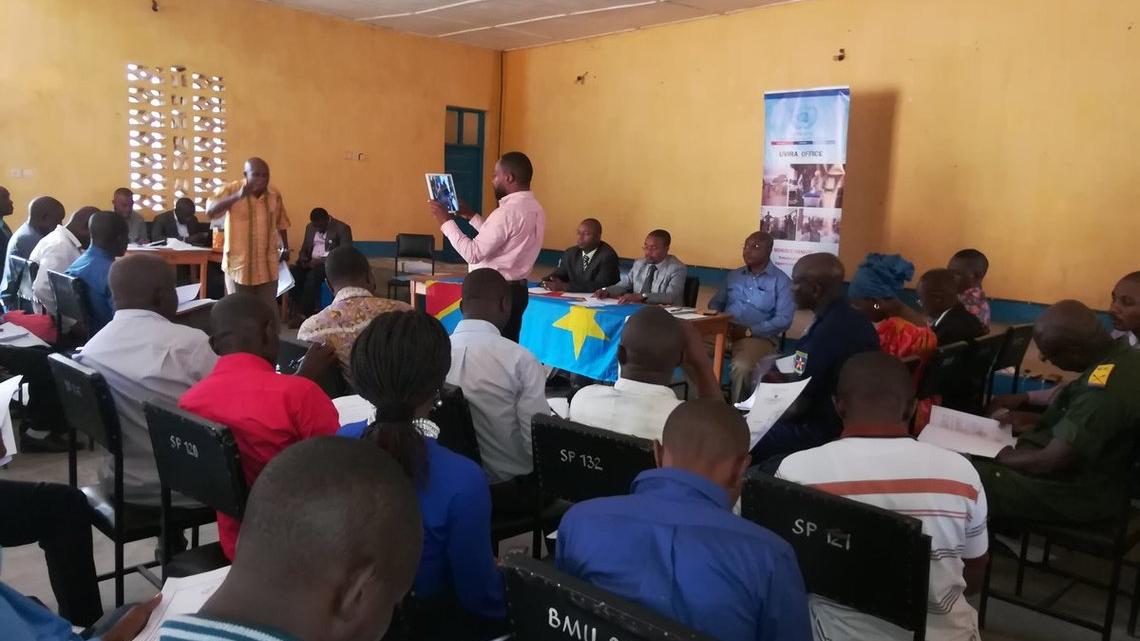 Les délégués, en discussion dans la salle polyvalente du bureau du territoire d’Uvira les 21 et 22 mai 2018, sur la recherche de solutions pour une paix durable à Bijombo. Une rencontre organisée par la section des Affaires civiles de la MONUSCO Uvira. Photo MONUSCO/Bilamekaso TCHAGBELE