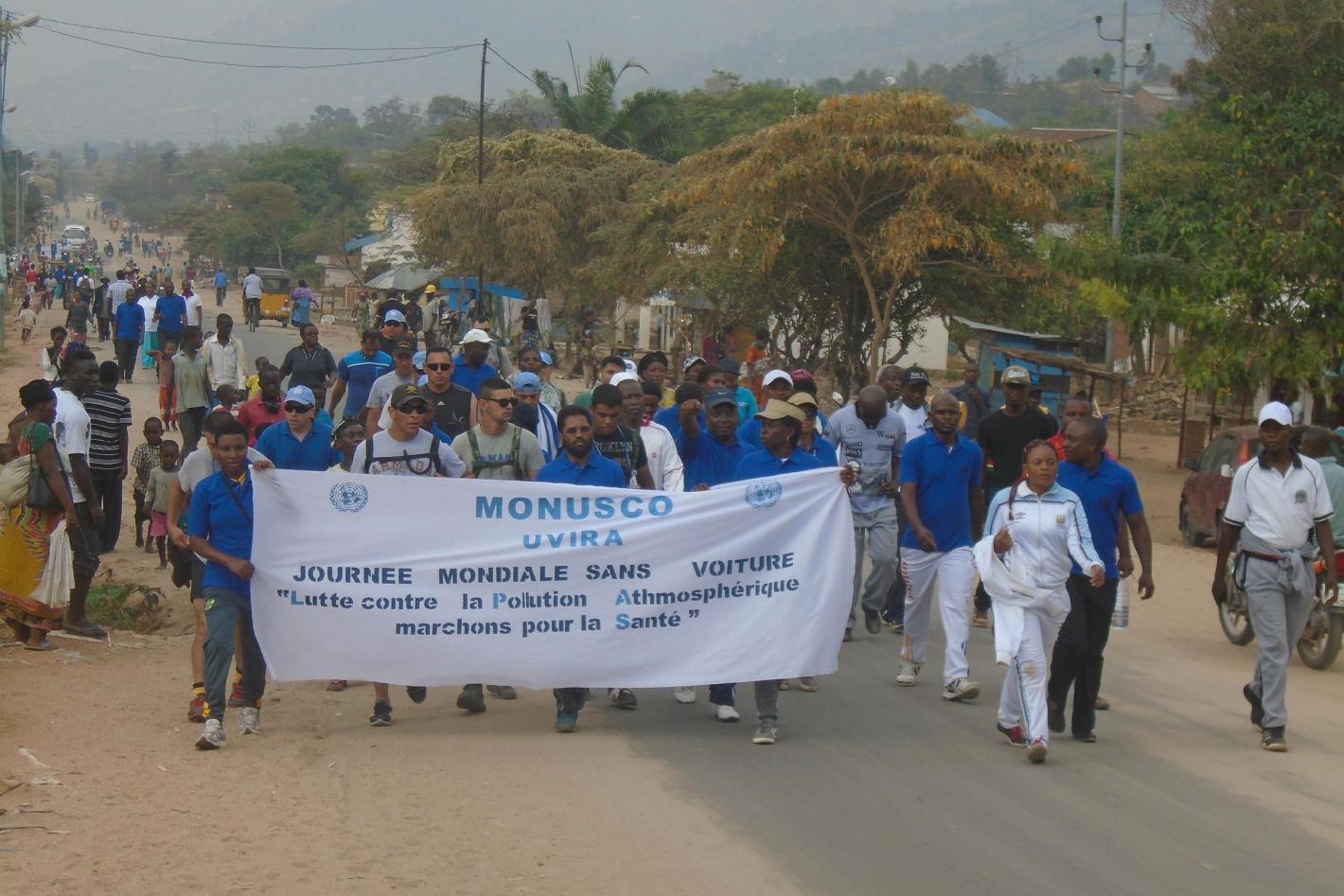 01 octobre 2016MONUSCOA Uvira, à l'occasion de la Journée Mondiale sans Voiture, la MONUSCO organise une marche pour sensibiliser la population contre la pollution atmosphérique.