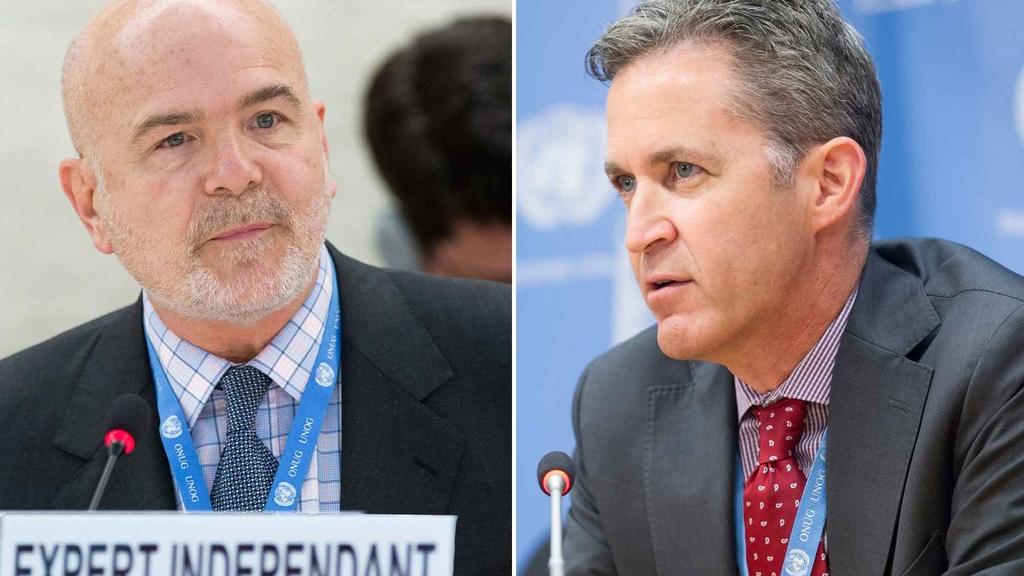 Michael Forst (à gauche), Rapporteur spécial sur la situation des défenseurs des droits de l'homme, et David Kaye, Rapporteur spécial sur la promotion et la protection du droit à la liberté d'opinion et d'expression. Photo ONU/Jean-Marc Ferré/Rick Ba