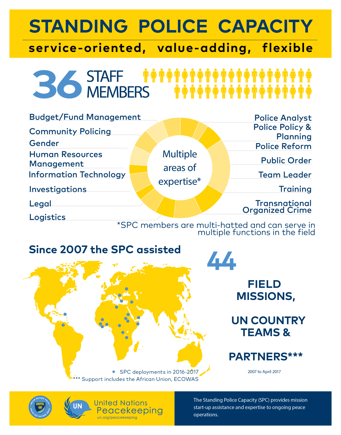 Le SPC fournit à 36 officiers des connaissances et expériences spécialisées, comprenant des réformes et restructuration de la police, de l’ordre public, de la criminalité transnationale organisée, de la police communautaire, des affaires juridiques, de l’analyse, de la formation, de la planification, de la logistique, du budget et de gestion des fonds, de ressources humaines, information et communication, technologie, enquêtes et services de conseil en matière de genre. Une fois déployé, le personnel de la SPC peut servir dans des fonctions à plusieurs casquettes pour: