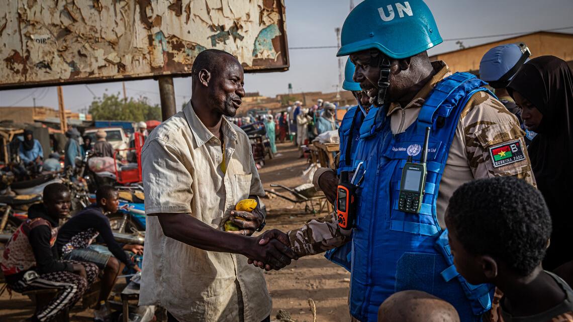“我们从集市入口开始徒步巡逻,这样能够经过每一家店铺,并和民众交流。接着我们会这样步行数英里,确保走遍整个集市。”联合国马里稳定团的联络官阿卜杜拉耶•穆罕默德 (Abdoulaye Mahamat) 解释道。