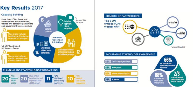 Beyond the deployment of PDAs, the Joint Programme also facilitates deployment of short-term expertise to respond and engage in crisis settings, provides coordinated and complementary UNDP and DPA support, analysis, and engagement in target countries, and builds on the expert knowledge of its stakeholders to share good practices, lessons learned, and engage in a community of practice. Aiming to serve as a platform that brings together various UN tools and approaches, the Join UNDP-DPA Programme contributes to coherent UN engagement by working in partnership with other UN entities, such as the Peacebuilding Support Office (PBSO), UN Volunteers (UNV) and UN Women.